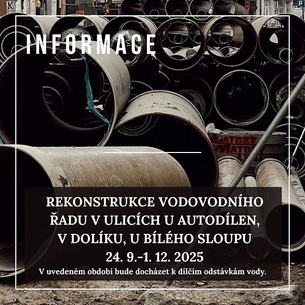 tímto si Vás dovolujeme upozornit na plánovanou rekonstrukci vodovodního řadu v termínu od 24. 9. do 1. 12. 2025 v ulicích U Autodílen, V Dolíku, U Bílého sloupu. V uvedeném období bude docházet k dílčím odstávkám vody.